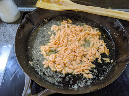 Begin cooking the pasta according to package instructions. Chop/flake the salmon. Chop the wild garlic (if using), separating the stems and leaves; chop or crush the garlic cloves. Heat the butter/oil in a sautepan, then add the garlic and wild garlic stems (if applicable).